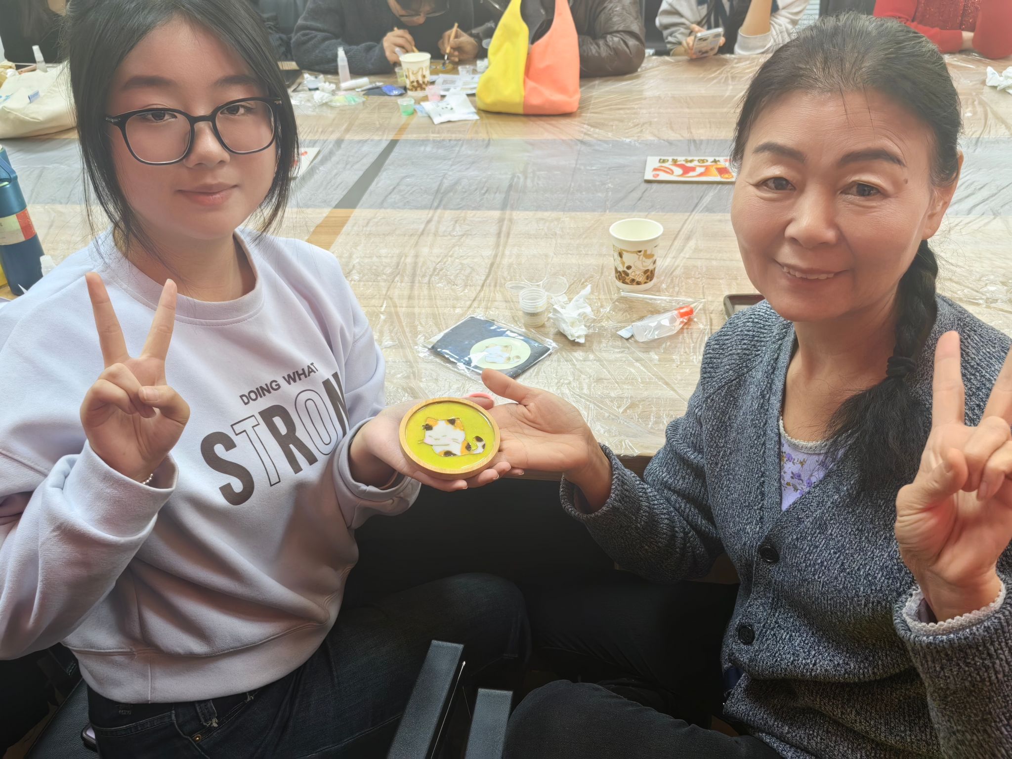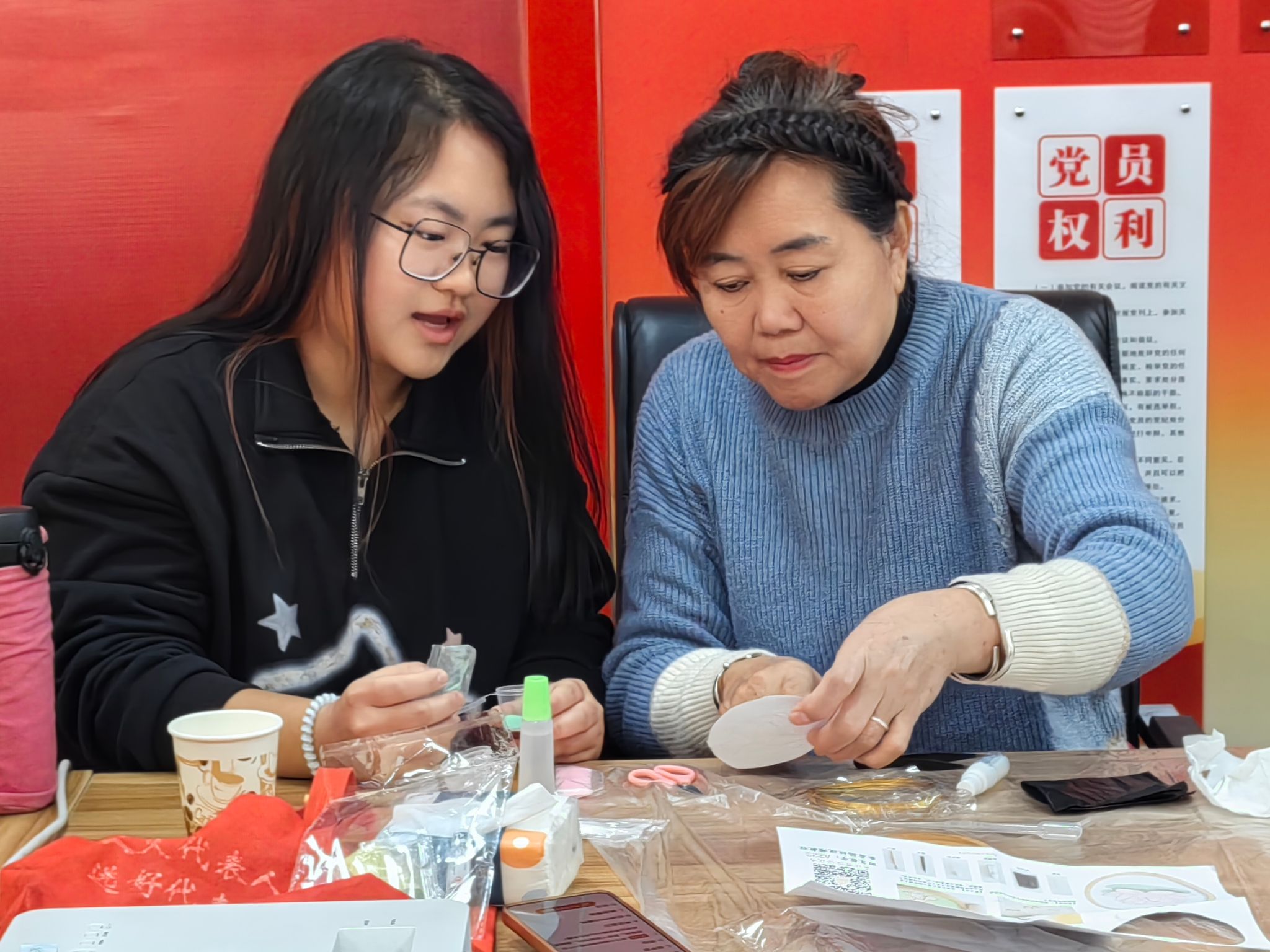 活动期间,同学们向社区居民介绍了掐丝粉彩技艺的历史渊源、艺术特色和制作技巧,分享了在津门掐丝粉彩技艺非遗传承基地的学习和体验经历。在同学们手把手地讲解和指导下,社区居民一步步地完成掐丝、调色、填充彩砂等步骤,制作出一个个精美的掐丝粉彩工艺杯垫。现场气氛热烈,居民们纷纷表示,通过参加本次活动,增长了知识、开阔了眼界,增强了文化自信和民族自豪感。