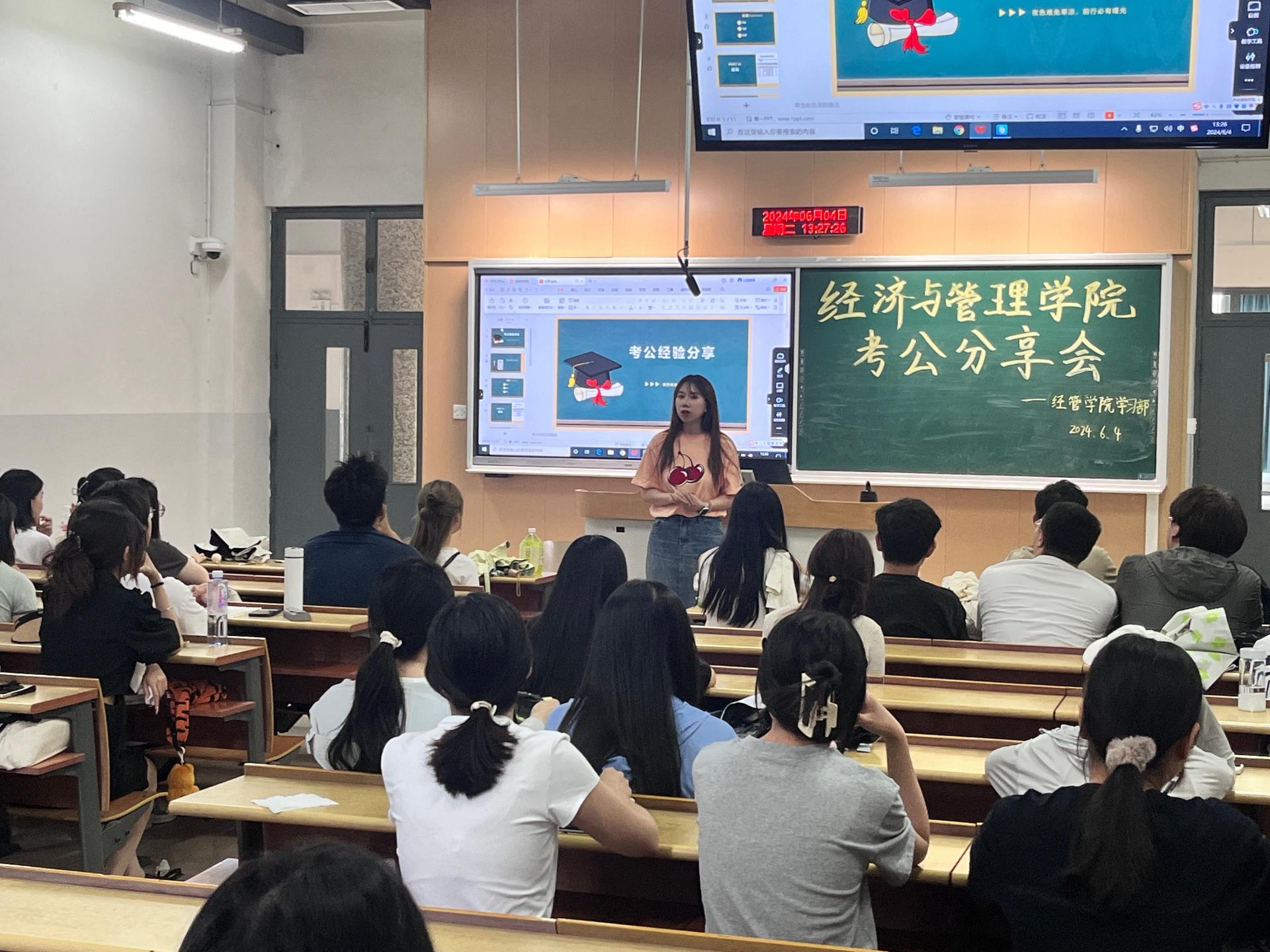 会上,四名优秀考公学子结合自身备考经历,分享了报考岗位选择、信息收集、复习时间规划、笔试备考技巧、面试心得以及心态调节等方面的经验,并鼓励大家勇于面对考公路上的曲折和坎坷,以积极饱满的状态投入到备考复习中。