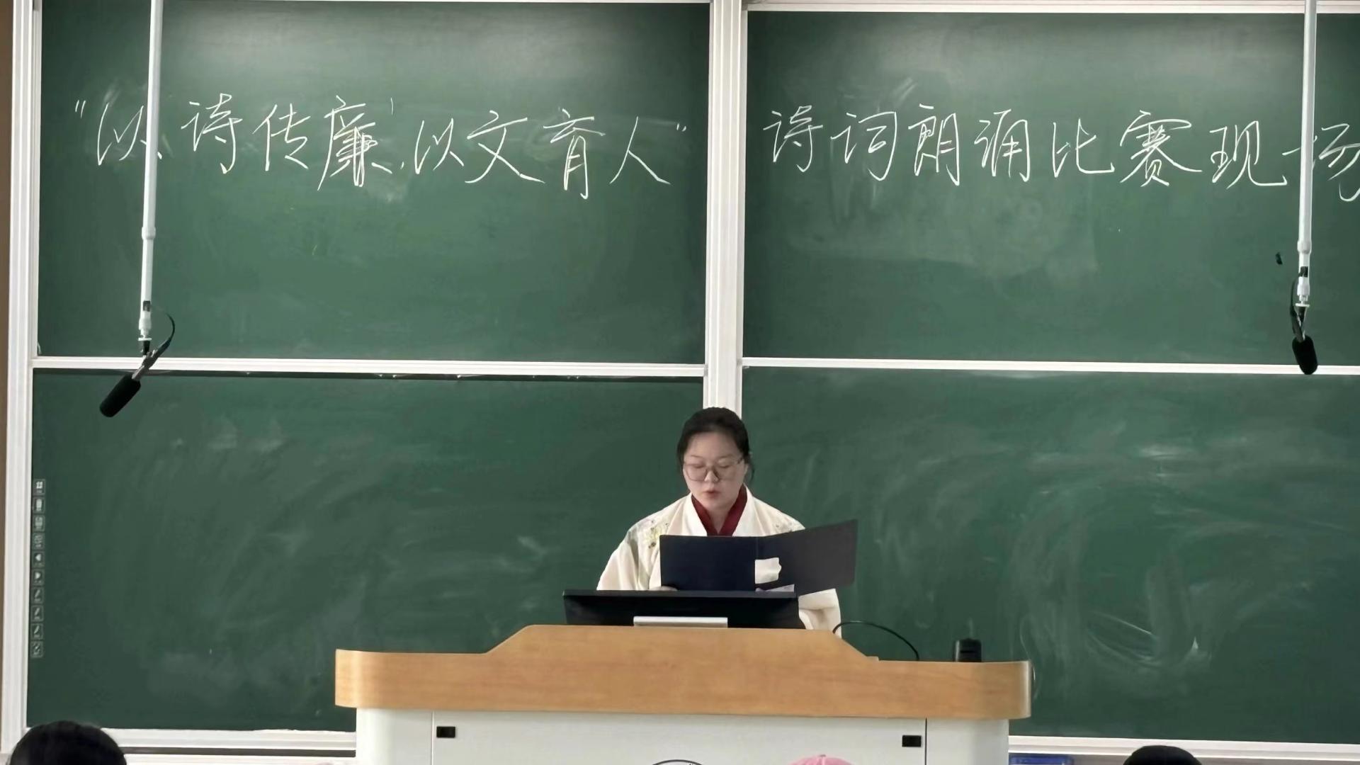决赛现场,各代表队紧扣清廉主题,以诗咏志、以诵抒怀,以青年之声传递清廉之风,诠释诗词的韵律和意境,为现场观众呈现了一场清如梅品、廉似兰香的视听演出。评委从朗诵内容、语言表达、情感姿态、服饰仪表、演讲技巧等方面进行现场打分。“一句‘出淤泥而不染,濯清涟而不妖’生动的描绘了莲的风度、莲的气节,我们不论身处何处,都要坚持自己,廉洁正直”。 经过激烈角逐,来自信管2301班的马煜桐同学以朗诵《爱莲说》摘得桂冠。