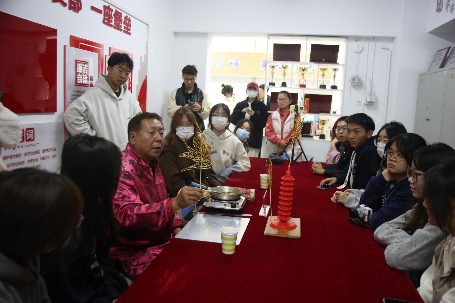 互动环节中,纪连友老师邀请同学们一起制作糖画。在他的指导下,同学们以铜勺为笔,以糖液作墨,不一会儿工夫,惟妙惟肖、生动传神的糖画就展现在眼前。同学们纷纷表示,通过近距离体验糖画艺术,进一步加深了对中华优秀传统文化的理解,努力争做弘扬中华优秀传统文化的传承者与传播者,立志成为堪当民族复兴大任的时代新人。