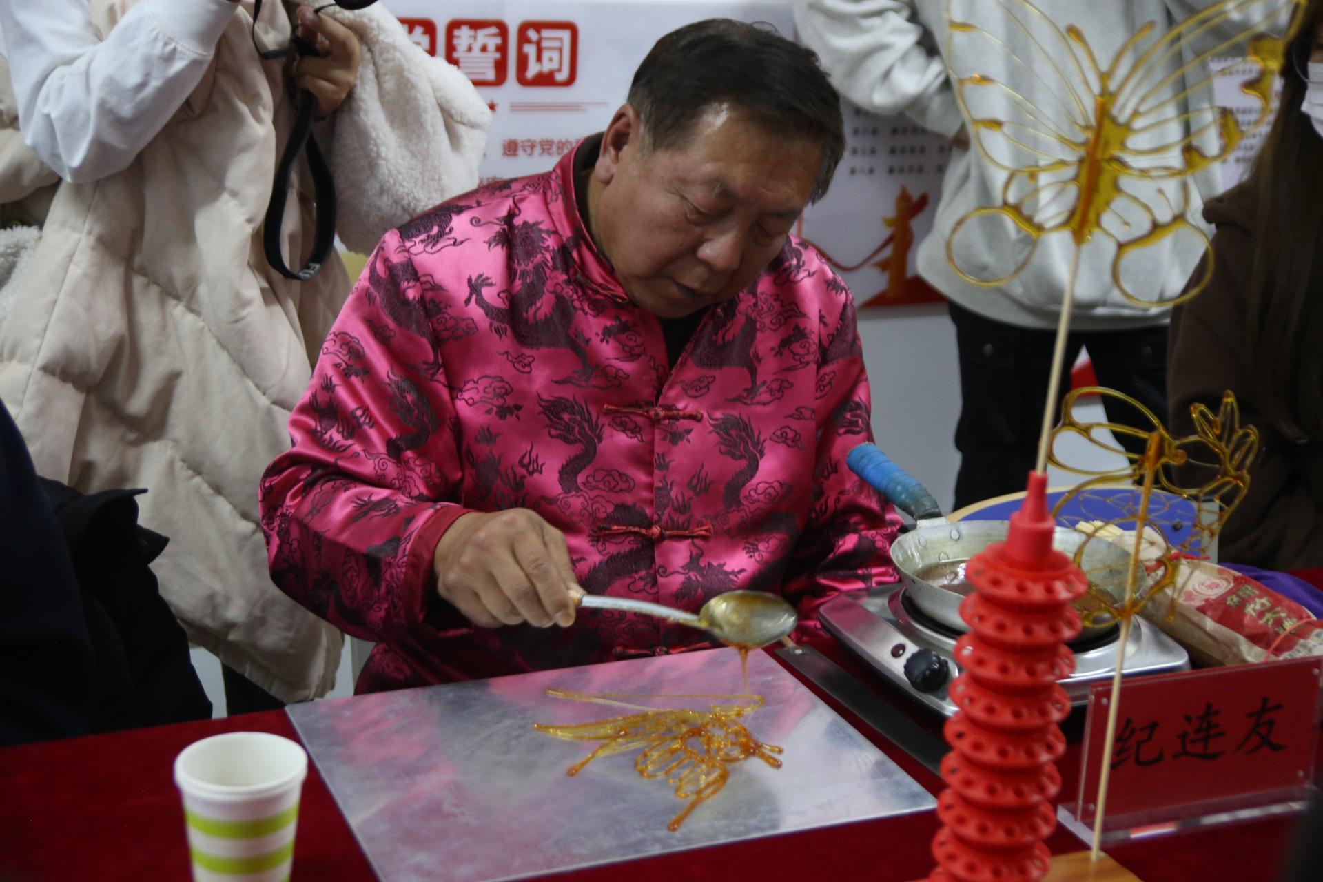 纪连友老师以唐代著名诗人陈子昂制作糖画的故事为开篇,生动地讲述了糖画的起源与发展。谈起学艺之路,他表示自己自幼受父辈的熏陶,对家传糖画技艺颇有兴趣。学艺期间,他苦心钻研技法,并且对原材料和制作工艺进行了大胆的探索和成功的改良,受到了广大民众的青睐。为了让糖画技艺走出国门,走向世界,他多次参加国内外艺术交流活动,其立体糖塑作品连续在国内外各项重要比赛中展出并获奖,充分展示了中华民族的美学智慧和艺术创造力。“当代中国力量的崛起,内核源自于中华优秀传统文化的回归”,纪连友老师表示,“中华文化在中国广袤的土地上传承了数千年,具有顽强的生命力和内在活力。这种力量充满智慧,无形无穷,不但能自我修复,更能顺时应势,在不同的时代和历史发展进程中持续传承。”