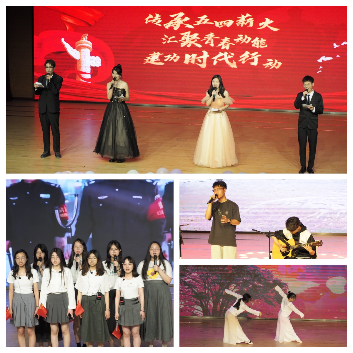“红五月”主题晚会分为“传薪火”“共青春”“建新功”三个篇章。伴随着开场舞,第一篇章“传薪火”拉开晚会的序幕。双人舞《芳华》、话剧《答案》和朗诵《祖国你就是我要唱的那首歌》的精彩演绎,使在场观众仿佛回到峥嵘岁月。中国的热血青年把青春化作烈火,点亮了新时代的序幕,用青春的力量在历史上留下浓墨重彩的一笔,一声声惊天动地的浑厚呐喊,一幕幕感人至深的情景故事,引起全场师生的情感共鸣。