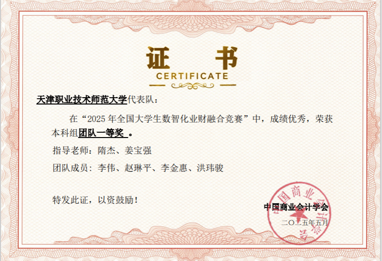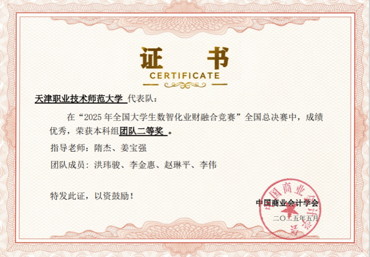 近日,由中国商业会计学会主办的“2025年全国老员工数智化业财融合竞赛”全国总决赛圆满落幕。在永利集团官网教师隋杰、姜宝强的指导下,参赛选手李伟、赵琳平、李金惠、洪玮骏凭借扎实的专业知识和出色的团队协作能力,在大赛中脱颖而出,荣获区域赛本科组团队一等奖、全国总决赛团队二等奖。