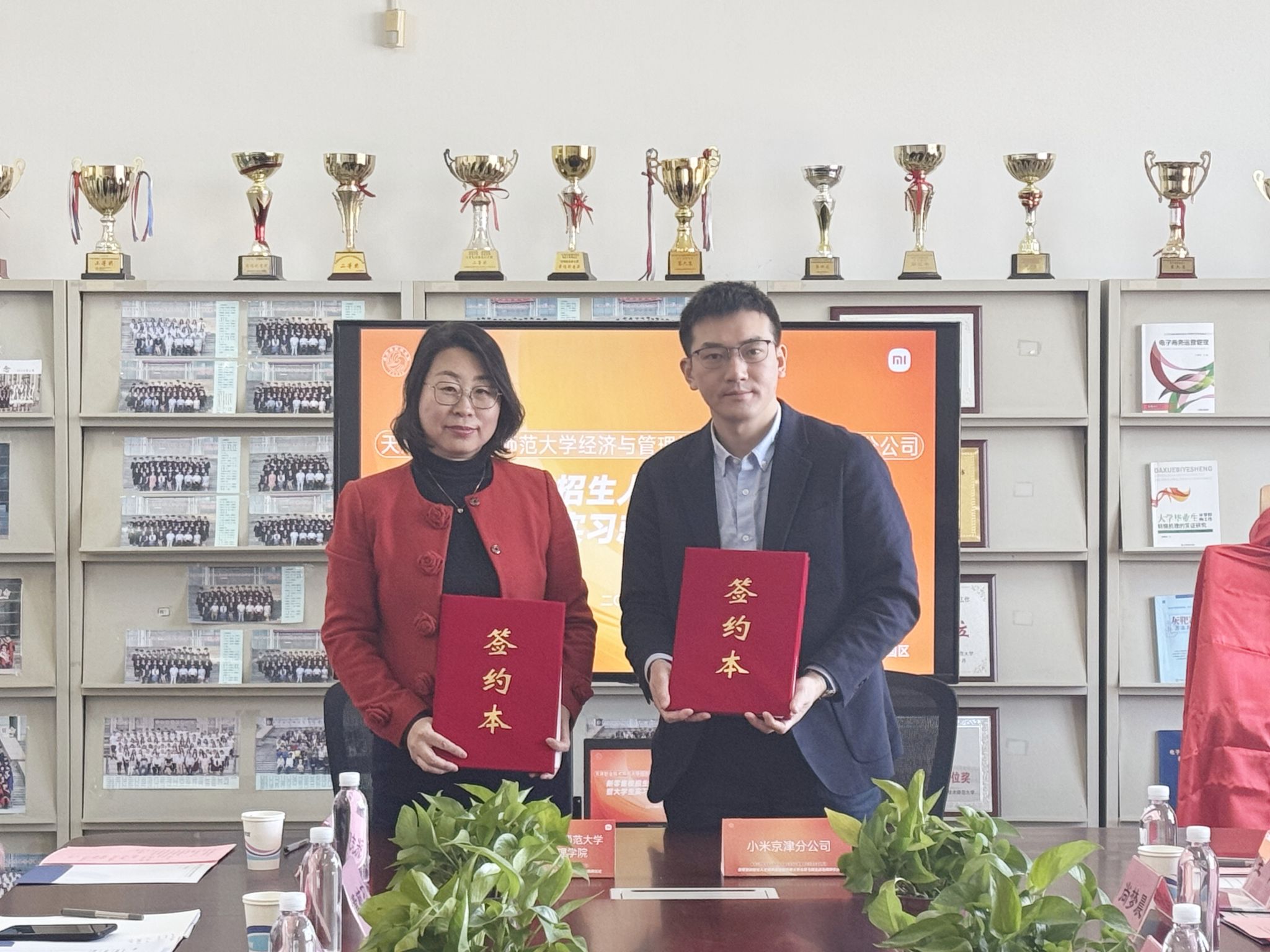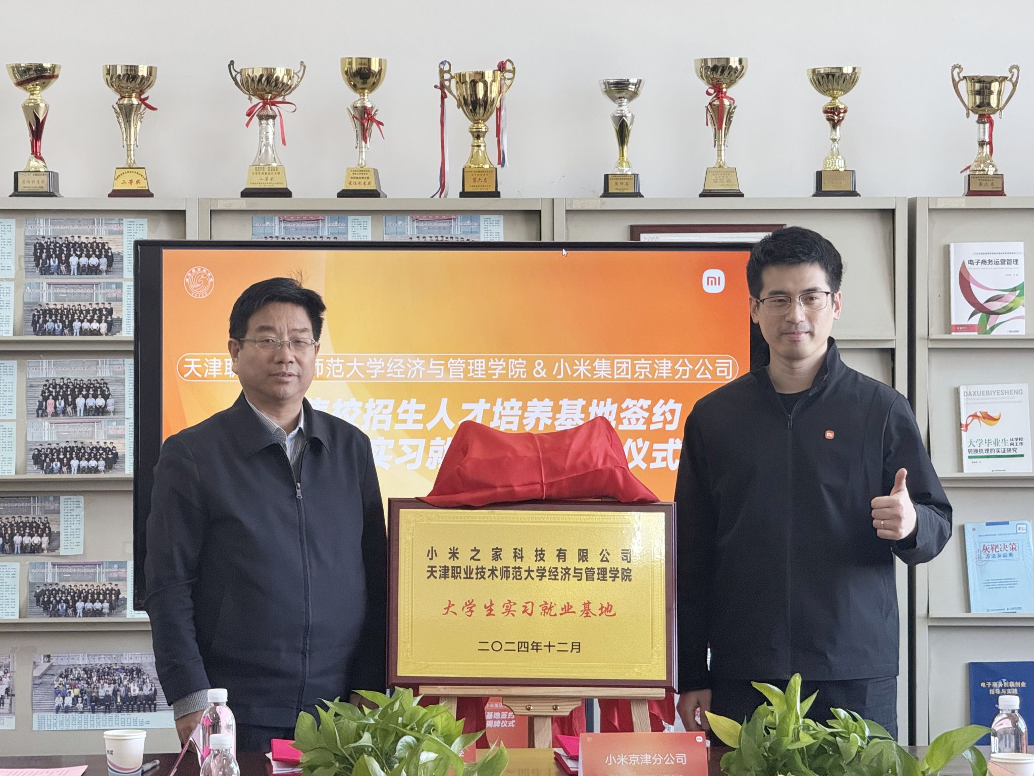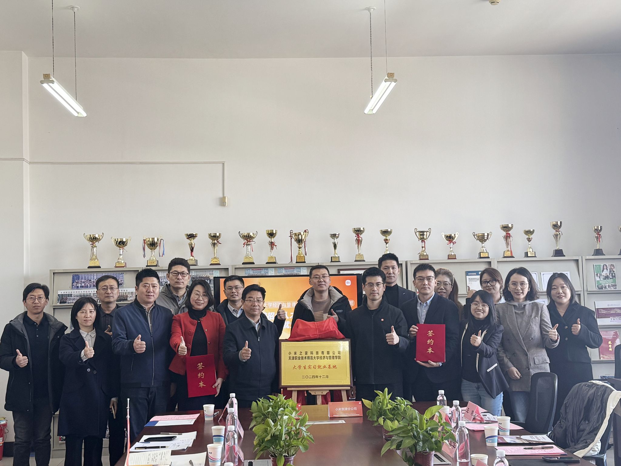 蔡玉俊、缪铮共同为永利集团官网实习就业基地揭牌,齐莉丽、小米集团京津分公司天津城市负责人梅昆代表双方签署了校企合作协议。随后,双方围绕产教研融合、人才培养、实习就业基地建设等方面进行了深入交流。