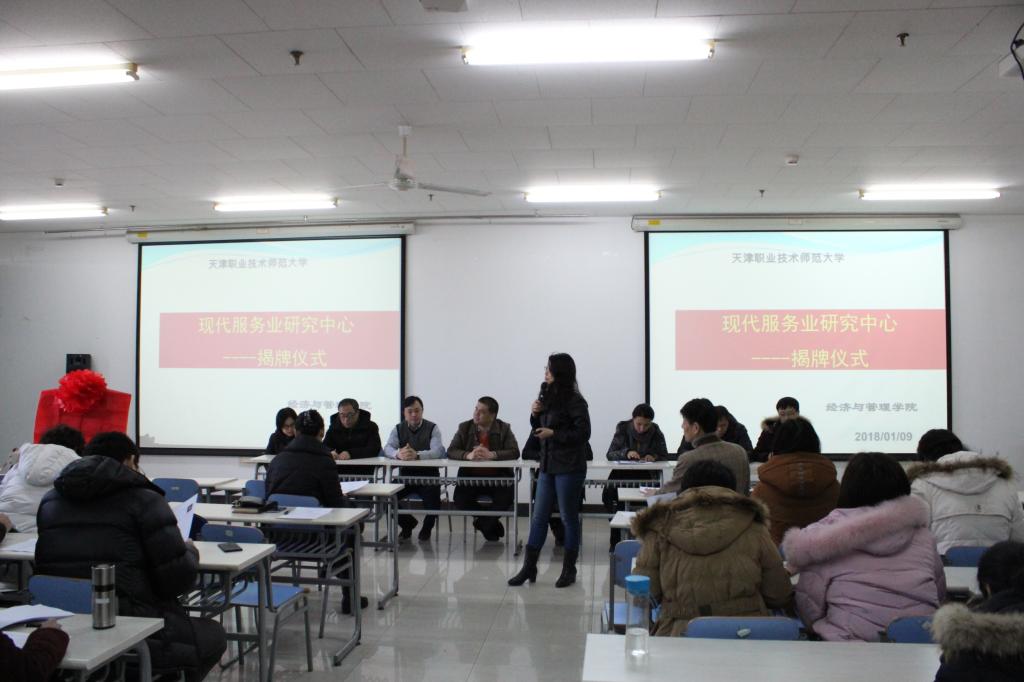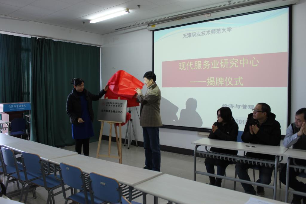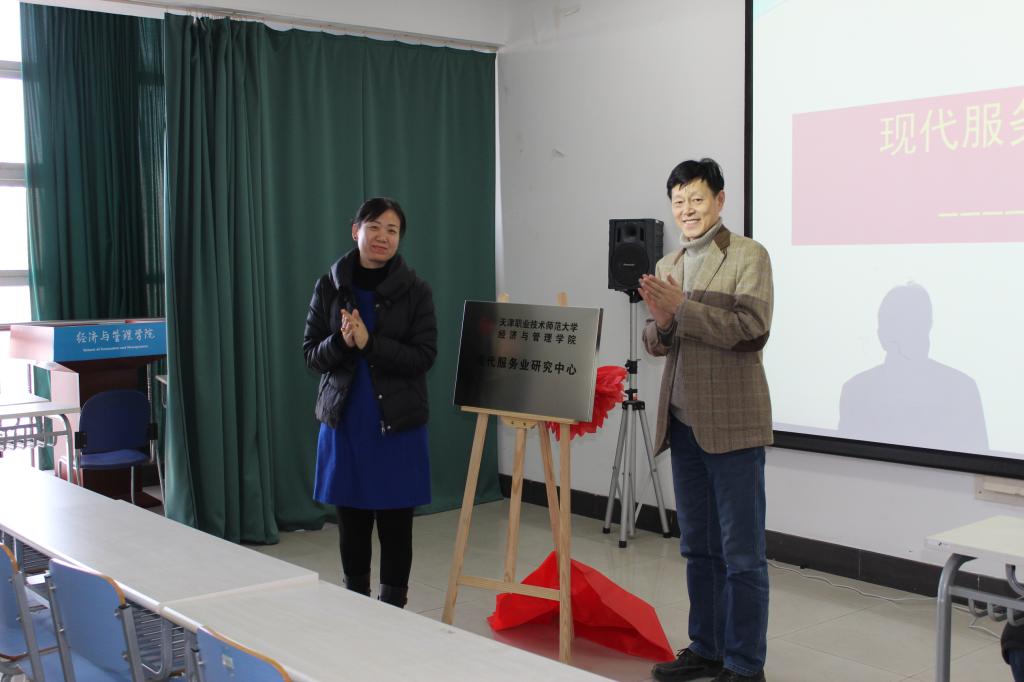 赵丽华和程中为现代服务业研究中心揭牌,齐莉丽从中心的成立背景、建设目标、组织机构、研究团队、主要职责等方面对现代服务业的基本情况进行了介绍,希望能在全院教师的努力下,力争将现代服务业研究中心建成为服务师生学术交流和学科发展、在天津市及京津冀地区有一定影响力和鲜明特色的研究平台和科研合作基地。