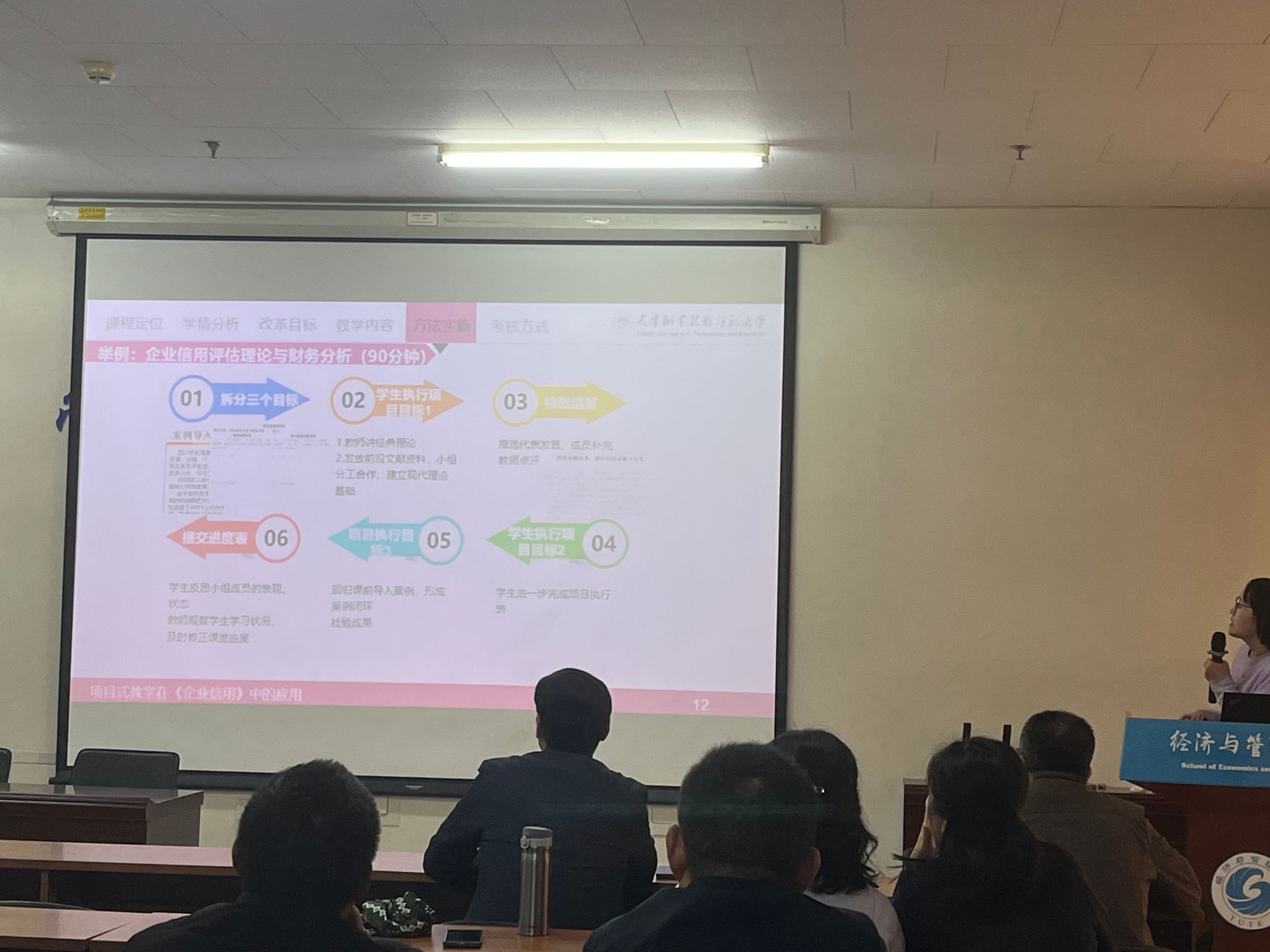 王晓辉老师围绕课程定位、学情分析、改革目标、教学内容、方法实施和考核方式等六个方面内容,重点介绍了以项目化教学课程设计为核心,重构《企业信用》课程体系的改革思路、路径和方法。